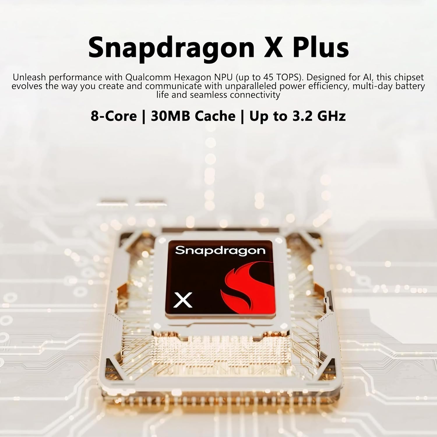 Snapdragon X Plus X1P 42 100 Processor (30MB Cache, up to 3.2GHz, 8 cores, 8 Threads); Qualcomm Hexagon NPU up to 45TOPS)