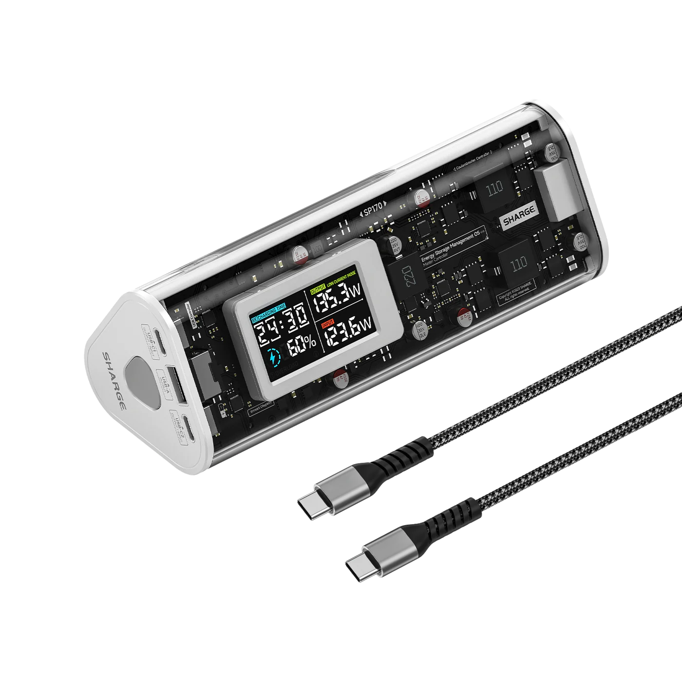 The Shargeek 170 is a high-performance 24,000mAh power bank delivering 170W of total output. Featuring a striking transparent aesthetic, it includes a smart digital display, PD3.1 triple-port fast charging, and EV-grade cells in an airline-safe chassis.